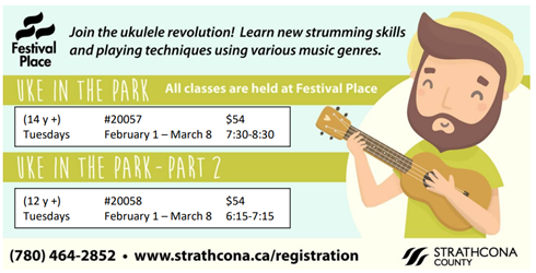 Uke in the Park – February – March 2022 Posted on January 26, 2022 by garygmusic Next week I’m back at Festival Place to teach ukulele…Call or go online to register your place in class! Share this: Click to share on X (Opens in new window) X Click to share on Facebook (Opens in new window) Facebook Like Loading... Related